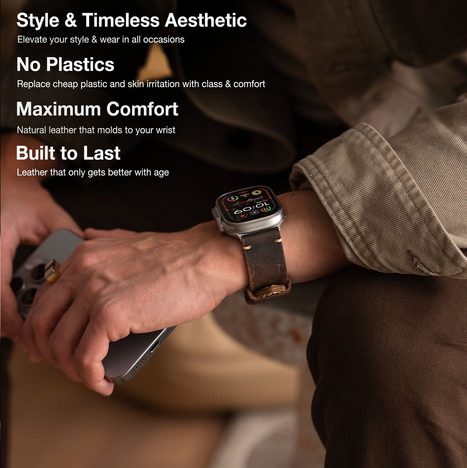 Elevate your Apple Watch with a band that combines ruggedness and vintage charm. Crafted from full-grain leather, it promises lasting quality and a rich patina. Enjoy a stylish accessory that complements any outfit.